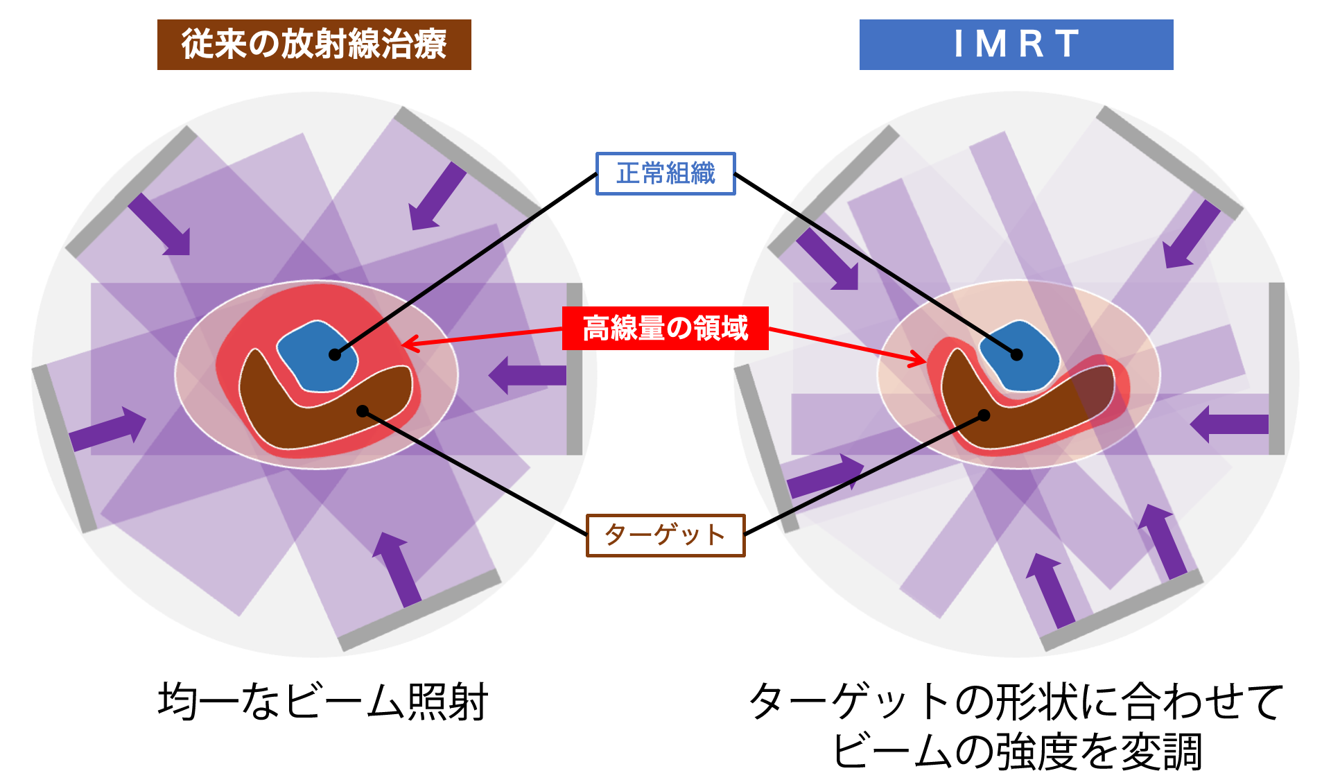 正常組織を避けつつ腫瘍の形に合わせた照射をするため、従来の放射線治療と比べて副作用を低減することができます。