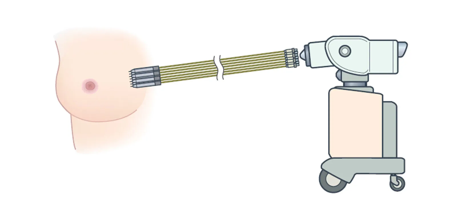線形加速器(リニアック)を使用した標準的な全乳房放射線と同様の方法で実施されます。しかし、PBIでは腫瘍を摘出した周囲の領域のみに焦点を合わせて行います。治療は1〜2週間にわたって1日1〜2回行われます。