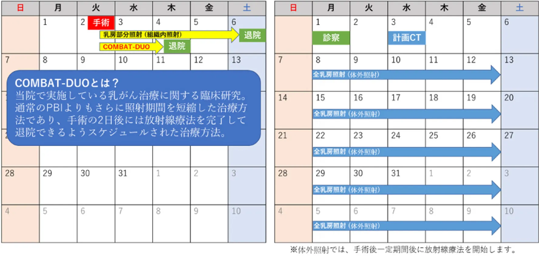 当院では①組織内照射を積極的に実施しております。また、臨床研究(COMBAT-DUO)としてさらに照射期間を短縮した治療方法を行っております。この治療方法では手術の2日後には退院可能であり、退院時には放射線療法が終了しているようスケジュールされております(図1)。