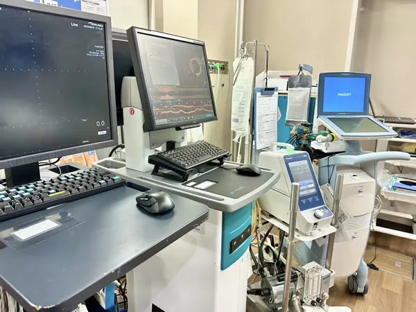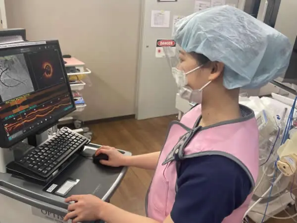 カテーテル検査業務では、検査・治療中の心電図記録に加え、IVUS(血管内超音波)、OCT(光干渉断層法)、FFR(血流予備量比)といった血管内評価機器の操作を行います。