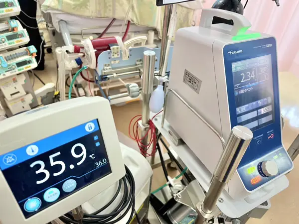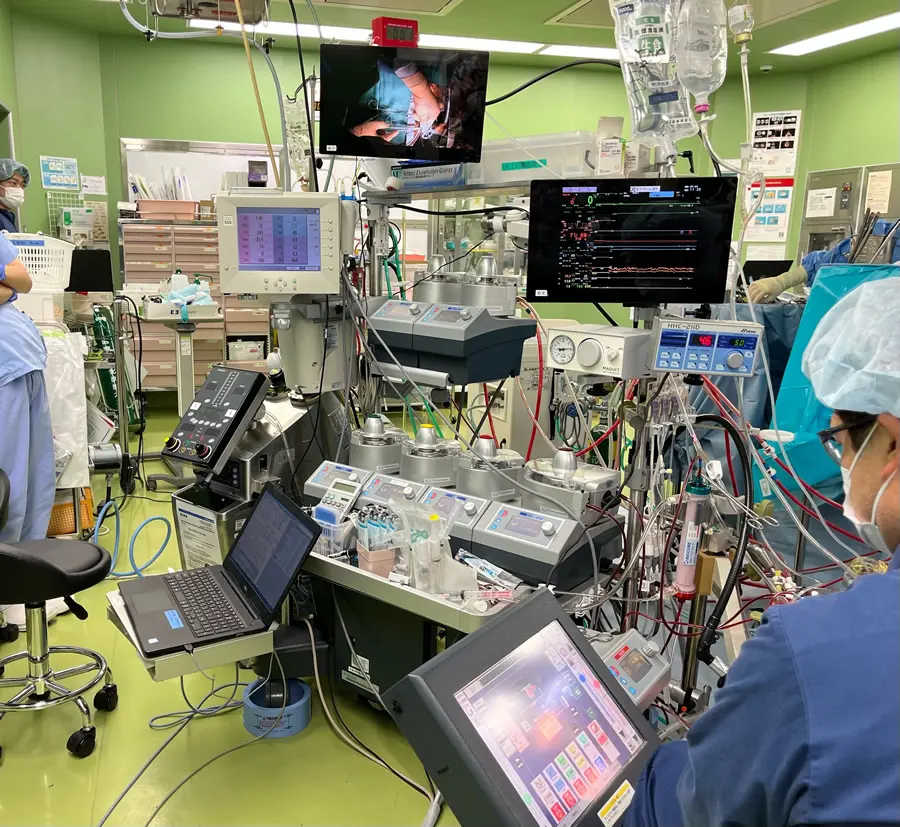 その際、臨床工学技士が操作する人工心肺装置が、心臓や肺の機能を一時的に代行し、全身への血液循環とガス交換を担います。