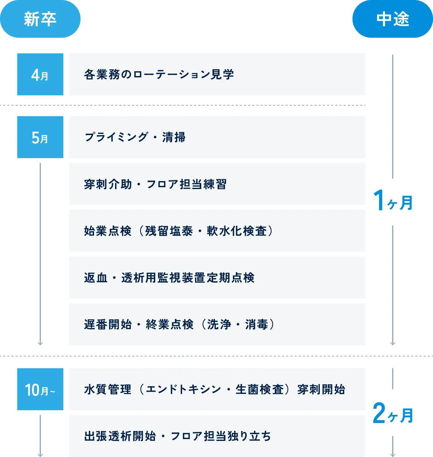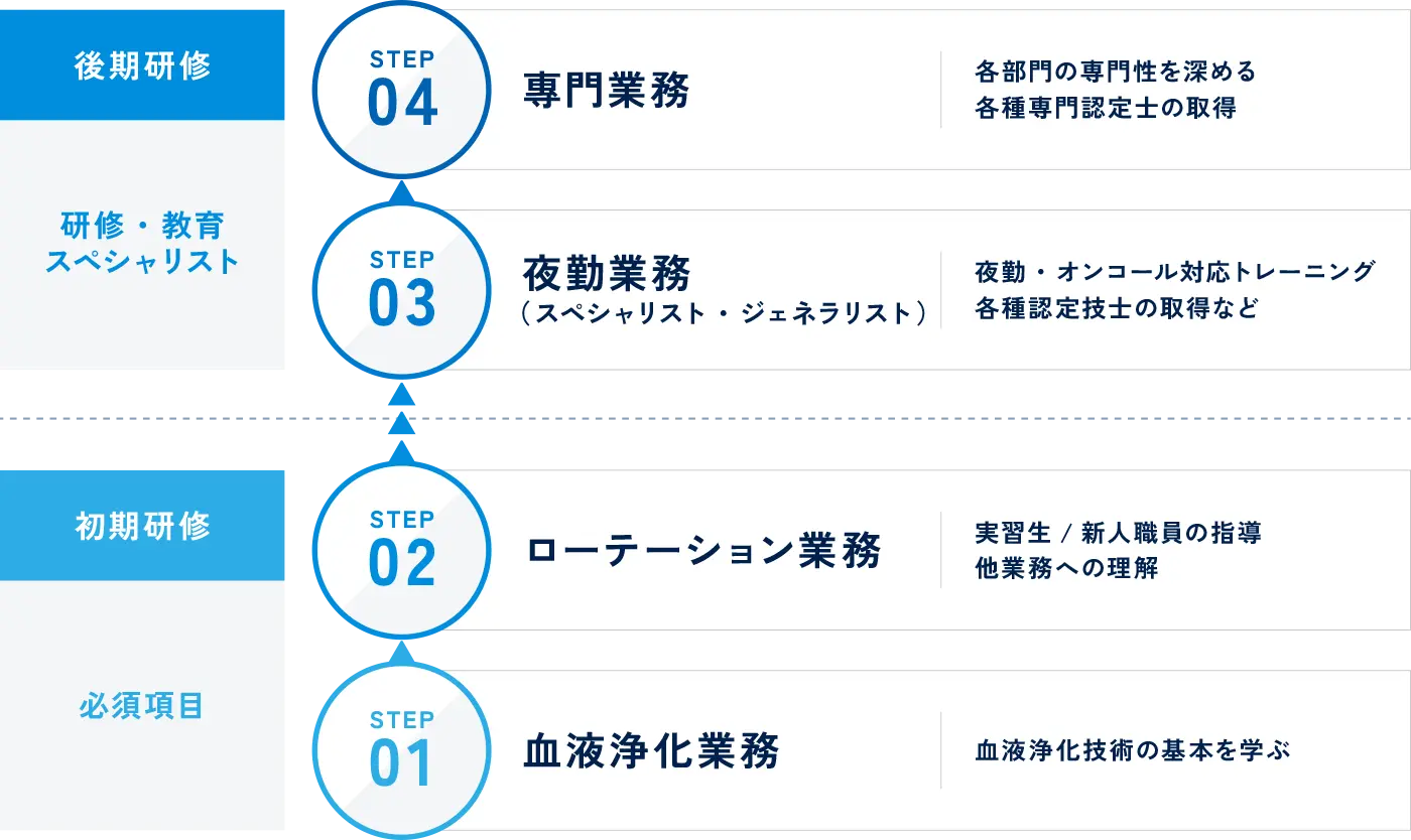 当院の臨床工学科は呼吸・循環・代謝の生命維持に不可欠な知識を一つの分野だけではなく、広く精通するスペシャリストかつジェネラリストになれるようローテーションを実施することにより、集学的治療に対応できる臨床工学技士の教育に努めています。