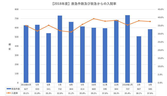 平成30年度には、7,519台の救急搬送を受け入れました。そのうちには、他院で受け入れ困難となり、5病院以上に断られたケース(いわゆる「たらい回し」)が約100台を含みます。また、近隣の病院での治療や入院が難しい患者さんの受け入れも行っており、二次救急医療を担う中核病院として強固な体制を整えています。