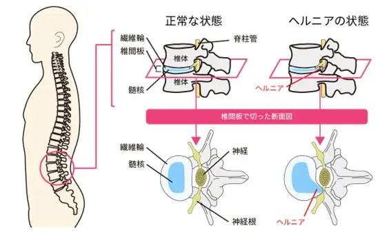 ヘルニアとは本来ある場所から飛び出たという意味で、腰椎椎間板ヘルニアとは腰の椎間板というクッションが飛び出た状態ということです。