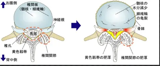 神経の通り道が狭くなると神経が圧迫され下肢へ放散する痛みやしびれが出ます。