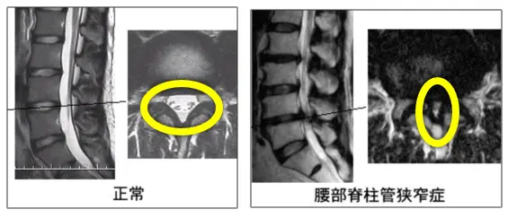 腰部脊柱管狭窄症とは腰の神経の通り道が狭くなる病気です。脊柱管というのは神経の通り道の名前です。神経の通り道が狭くなる一番大きな原因は、年齢による変化で黄色靱帯という靭帯が肥厚することです。