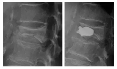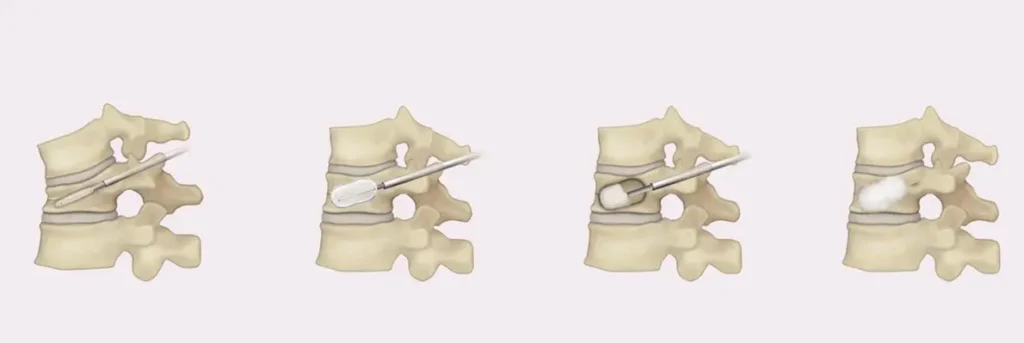 BKPは骨折してしまった背骨の中で風船を膨らませ、つぶれを直し、セメントを充填して骨を固定する方法です。