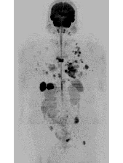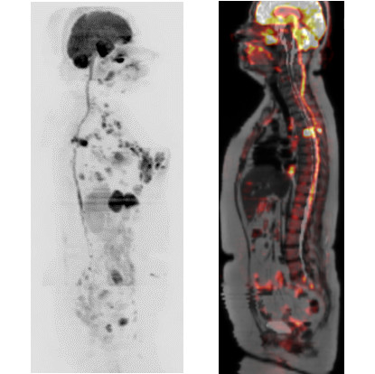 DWIBSは細胞間の「水の拡散状態」、PET/CTは細胞の「エネルギー(ブドウ糖)代謝」を反映している特徴の違いがありますが、類似した画像が得られます。