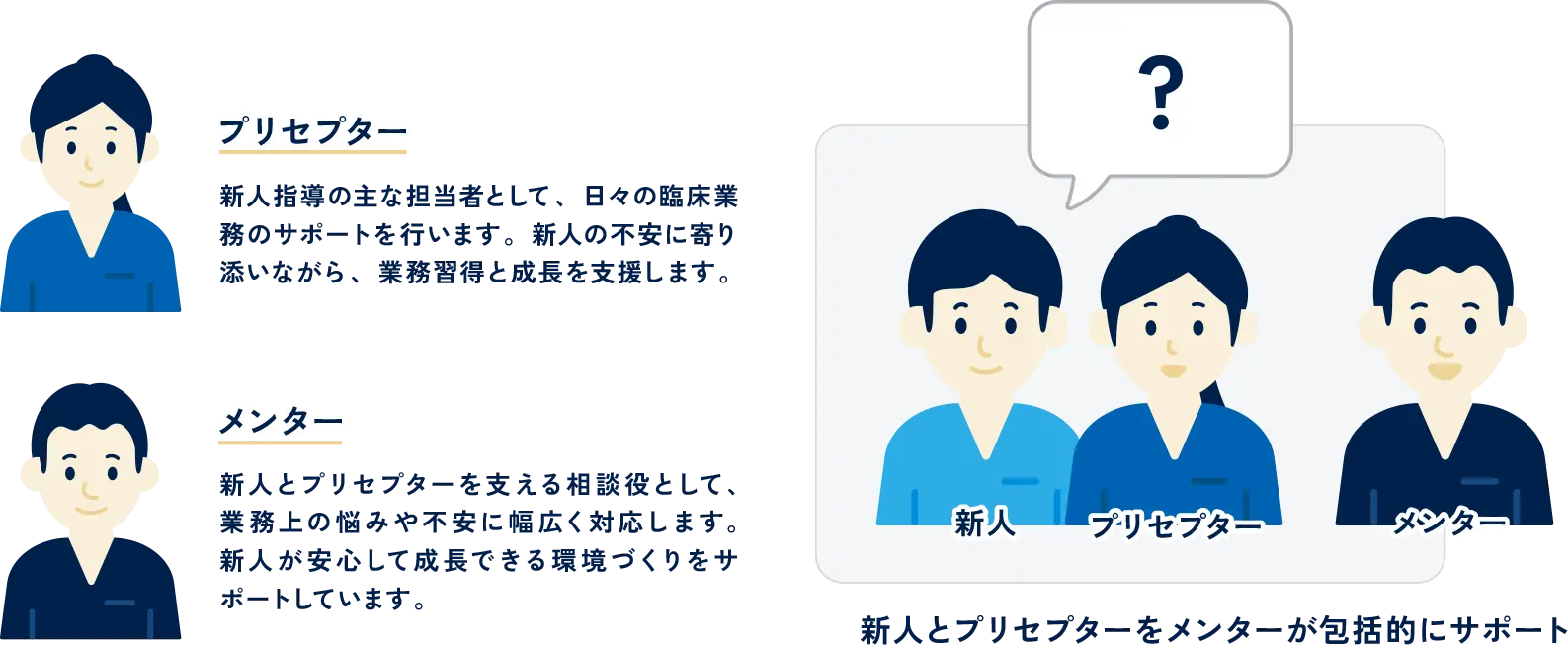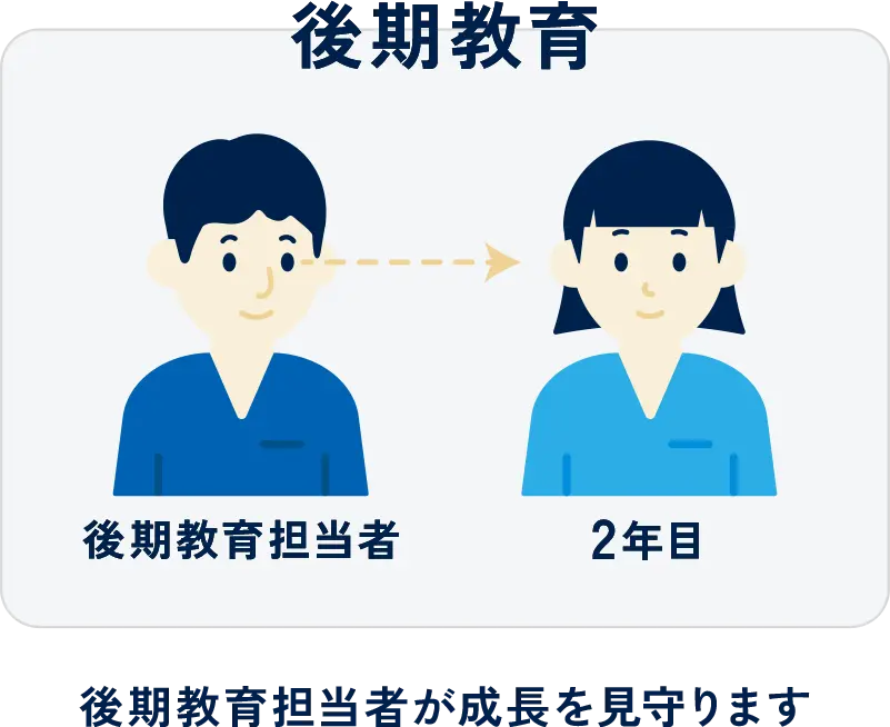 当院の前期教育は、プリセプター制度とメンター制度を組み合わせた体制で行っています。新人が安心して成長できるよう、段階的な支援体制を整えています。