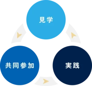 業務は、見学から始まり、共同参加を経て、徐々に単独実践へと進みます。