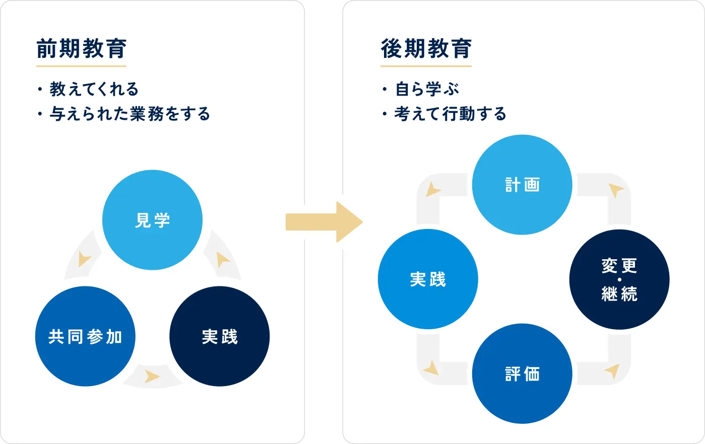 卒後2年間を新人教育期間とし、入職1年目を前期、2年目を後期と位置付けています。療法士としての専門能力に加え、社会人・医療人としての基礎力を育成します。