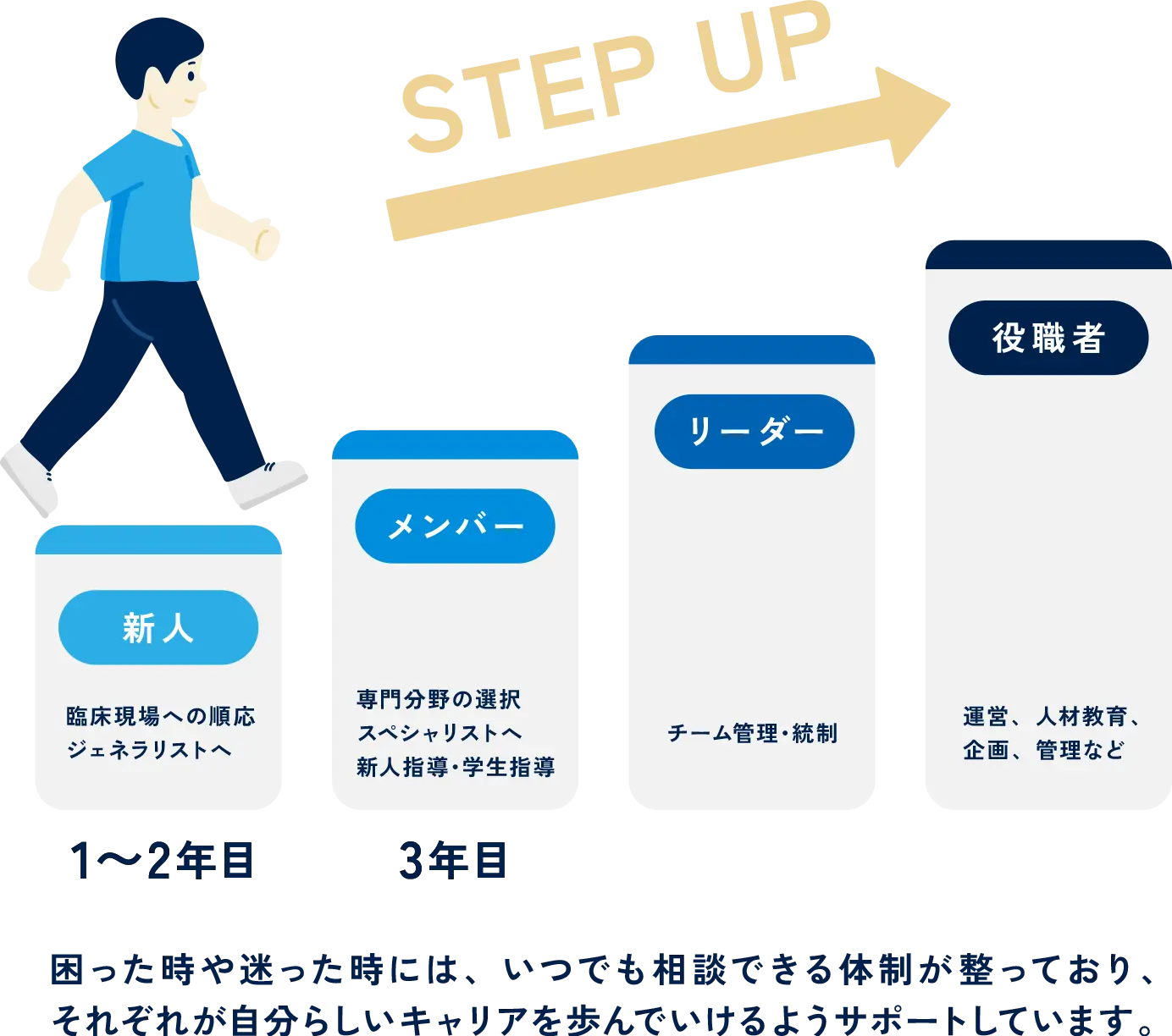 自らの専門性を高めるためのステップアップ期間に入ります。興味のある分野や将来のビジョンに応じて、成長の方向を定め、専門家としての道を歩み始めます。あわせて、医療従事者・社会人としての素養も引き続き磨きます。